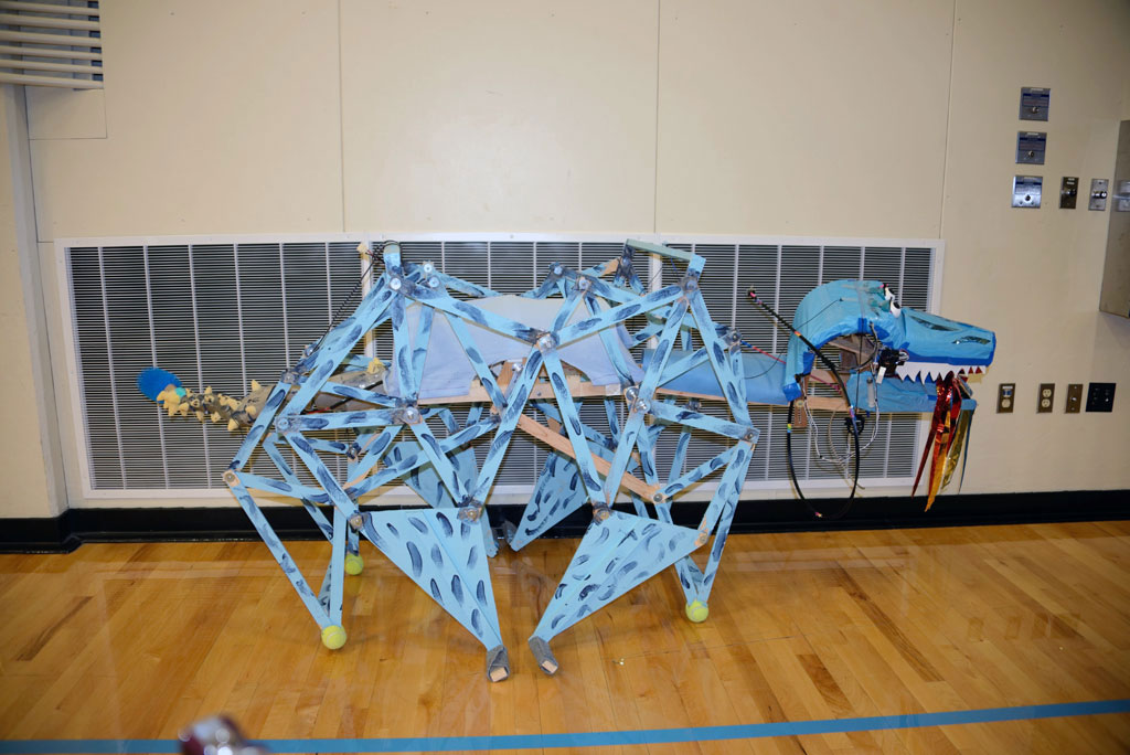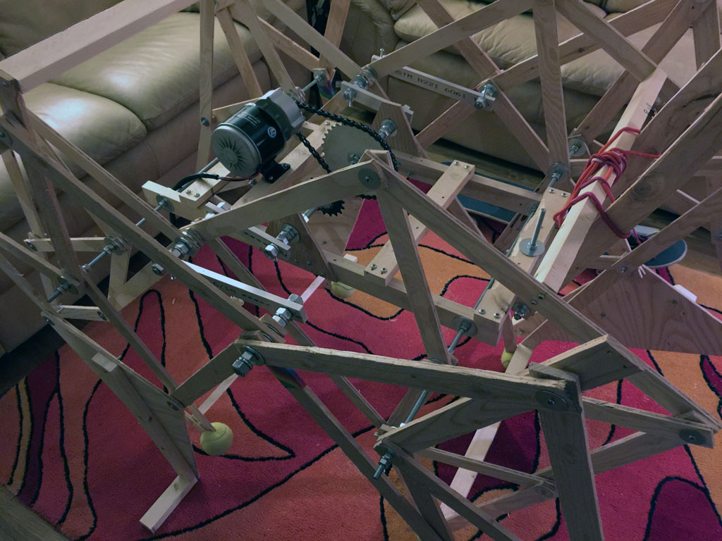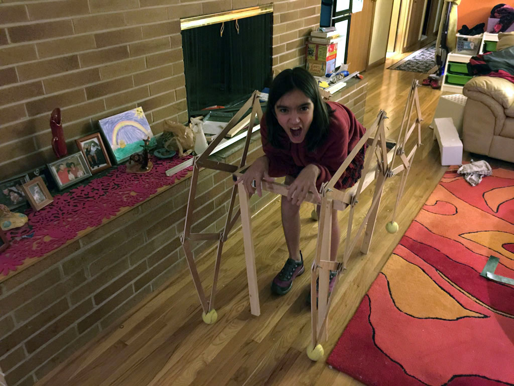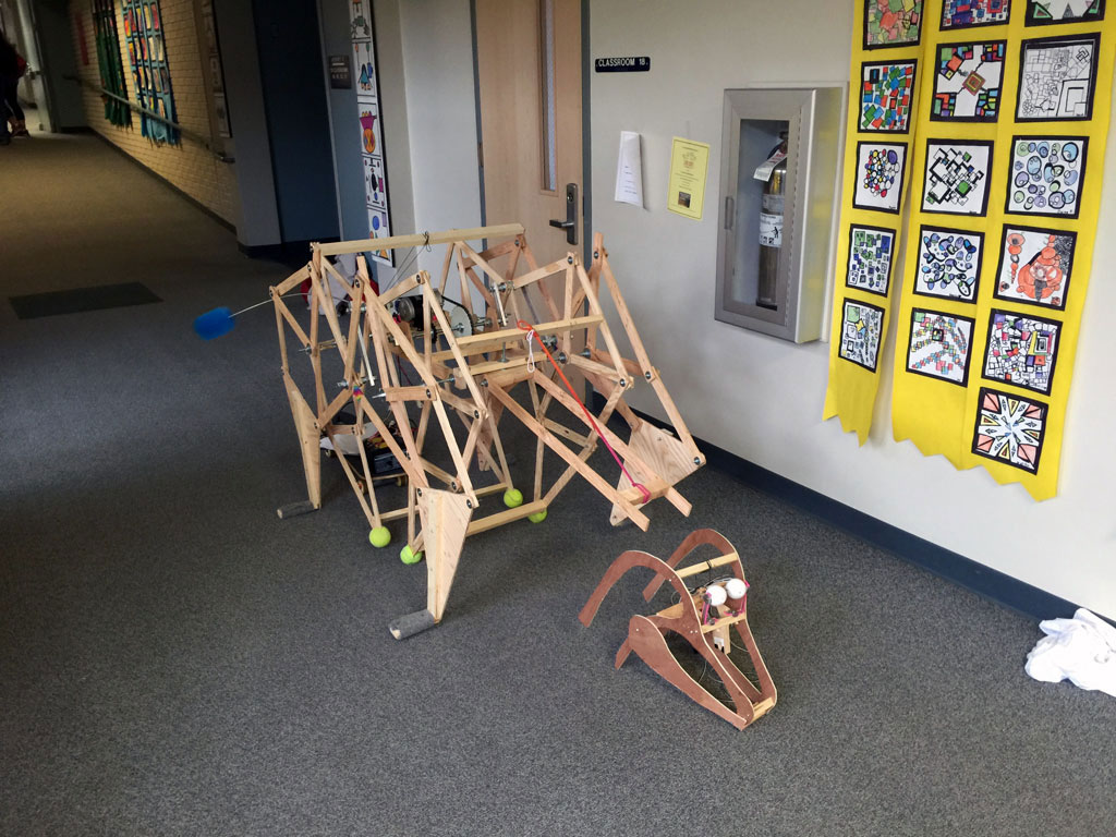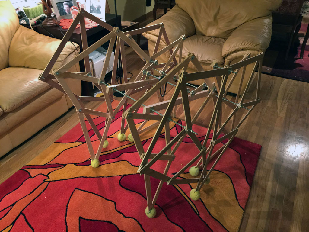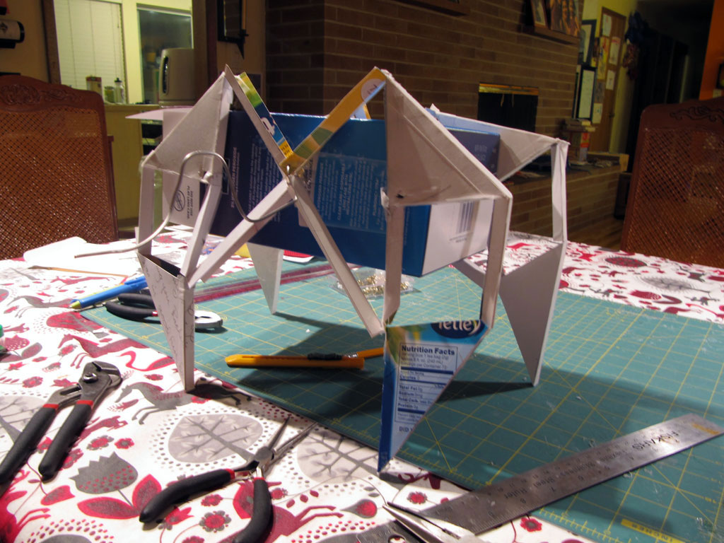 Once DI started, I looked online for ways to make a creature walk, and I found Theo Jansen's Strandbeest walking mechanism, and decided to make a prototype out of cardboard...