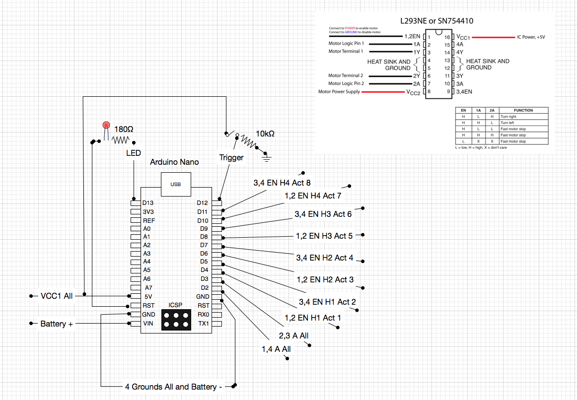 Here is a diagram of the Arduino, H-bridges and reed switch: