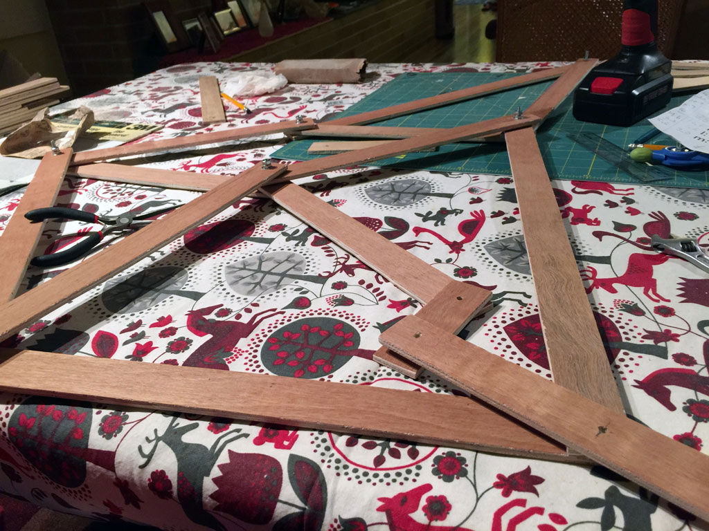 I tried a few different types of wood for the legs. I was very tempted to use paint bucket stirrers, because they are really cheap, but I figured they wouldn't be strong enough. I started out with 3-ply plywood. Later, I switched to sticks I found at Home Depot that were about the same size, and very cheap, sold as a pile of sticks.