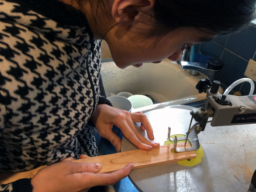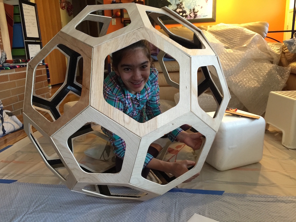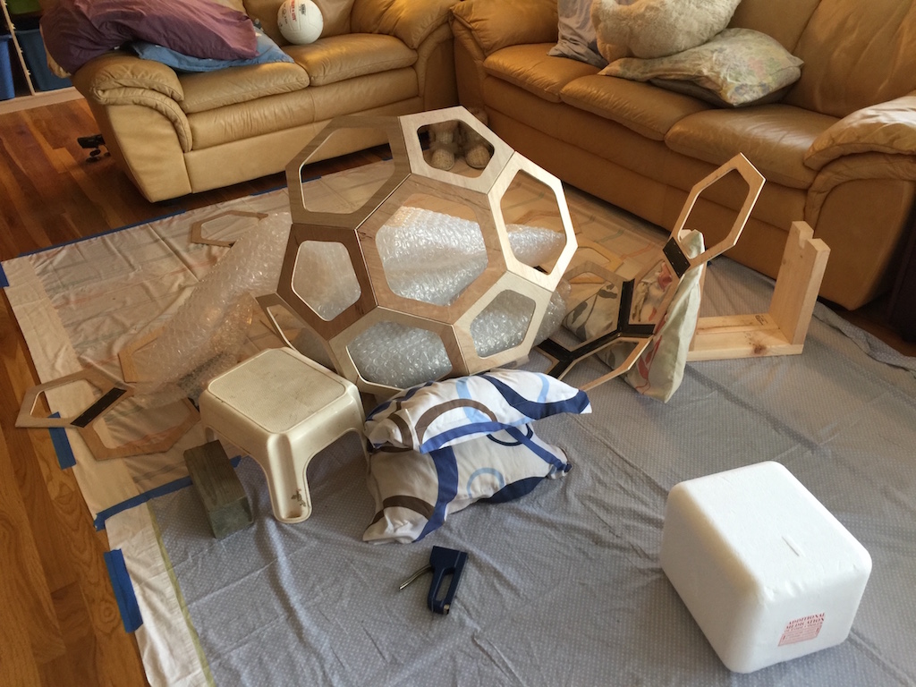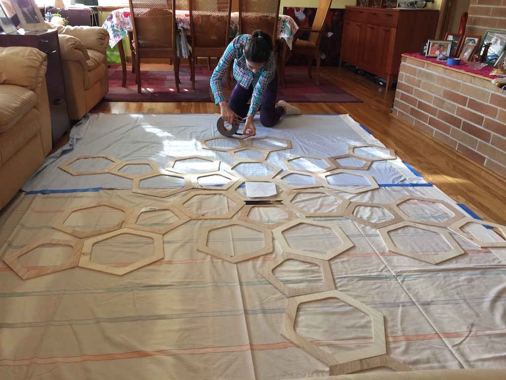 For the buckyball's pentagons and octagons to be truly symmetrical and all fit together, I made a number of templates using cardboard, a ruler and compass. It was very hard to get all the edges to be the same length. Luckily, once the templates were good, it wasn't so bad to cut out the pieces from plywood using a scroll saw. But, it took a lot of time.