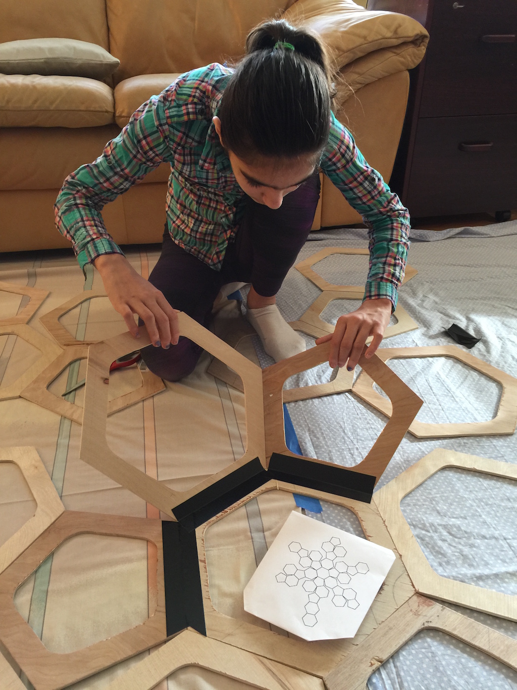 I found a picture of a Spiromicrovirus online that looked really interesting, and looked into various ball-like structures. Buckyballs seemed like a good way to start, and I found a template online, that I copied, and scaled up. I learned two years ago that it's really important to make big structures in DI to really impress the audience, and then I learned last year that it's really important for them to fit through doors (see Bluthe). So, this time, I made sure that the ball would come about to be just a bit less than 3 feet in diameter, by using a "truncated icosahedron calculator" online.