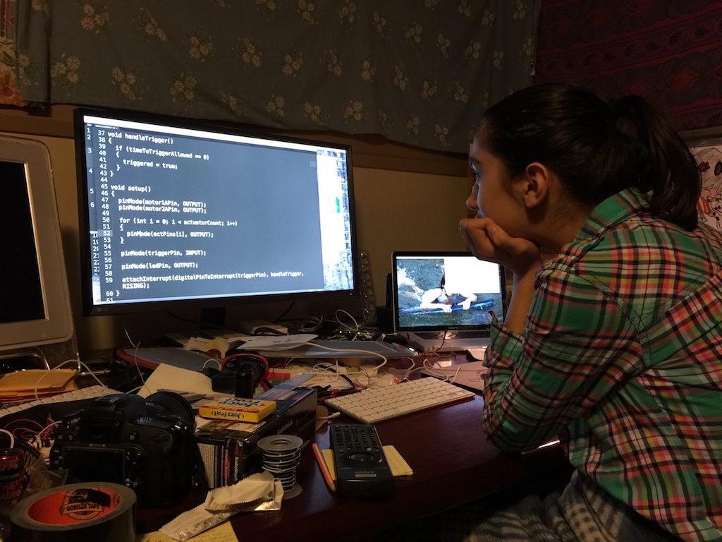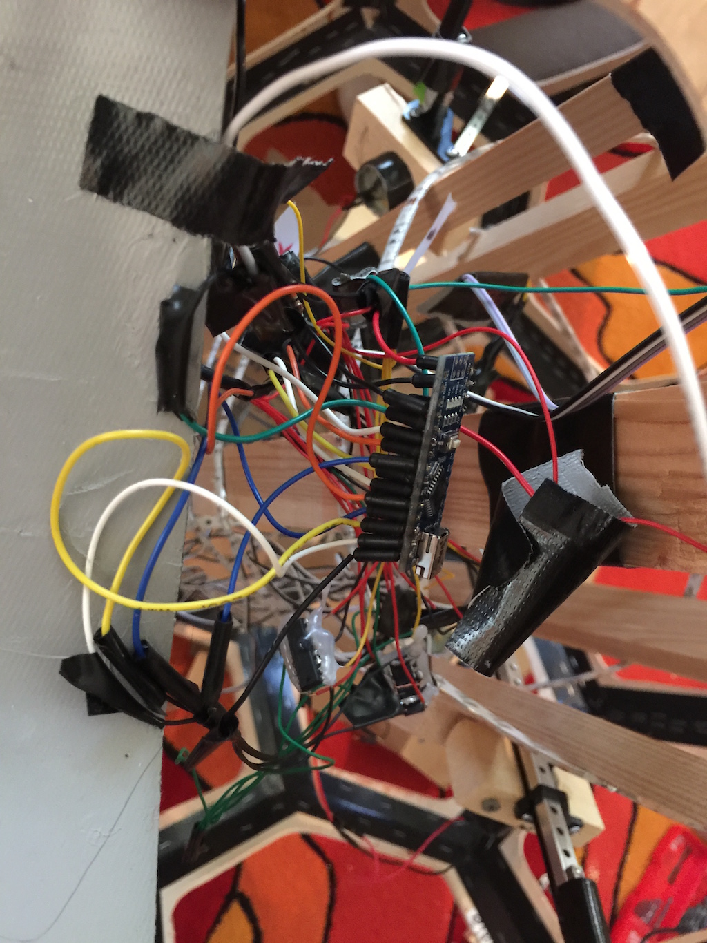 Now, to make the actuators move when I wanted them to, I hooked them up to chips with H-bridges, that convert the low voltage from the Arduino outputs to the full voltage and power from the big 12-volt batteries. These were the same ones I used for Bluthe last year, but now separately, one for the actuators, and one for the lights. I tried to use 24 volts for the actuators, but the Arduino burnt up pretty fast when I tried that. (In all, I burned through 3 Arduino Nanos). The wiring of 8 actuators was a true rat's nest!