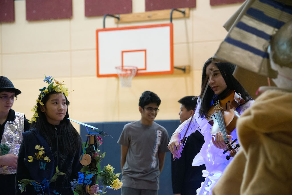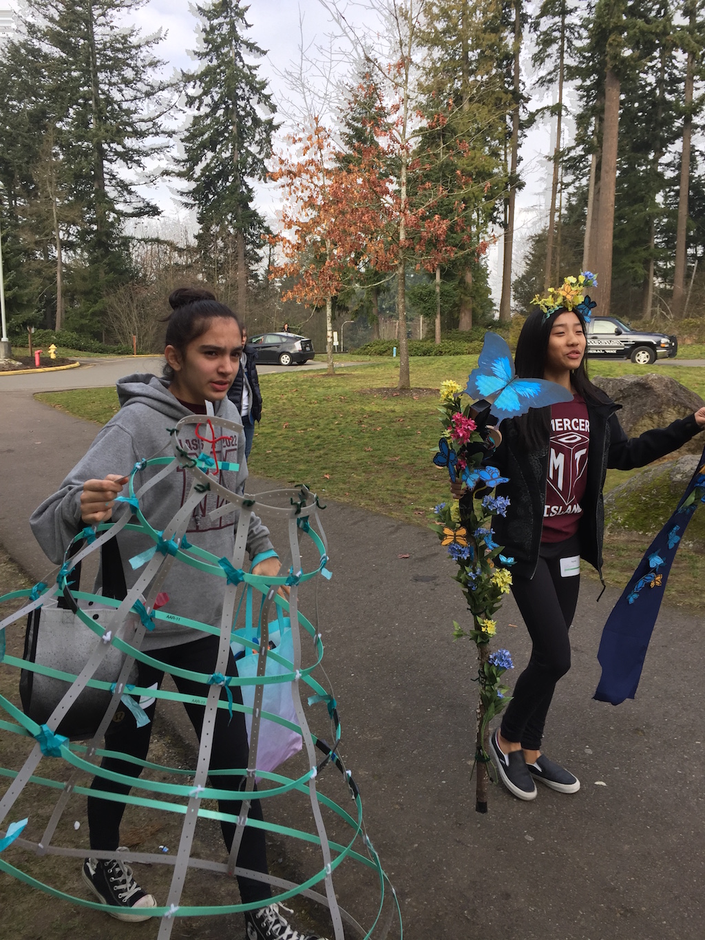 I had originally planned for the butterfly dress to have little motors or air tubes, but we were running out of time, so I made a flapping butterfly staff for the butterfly dress instead.