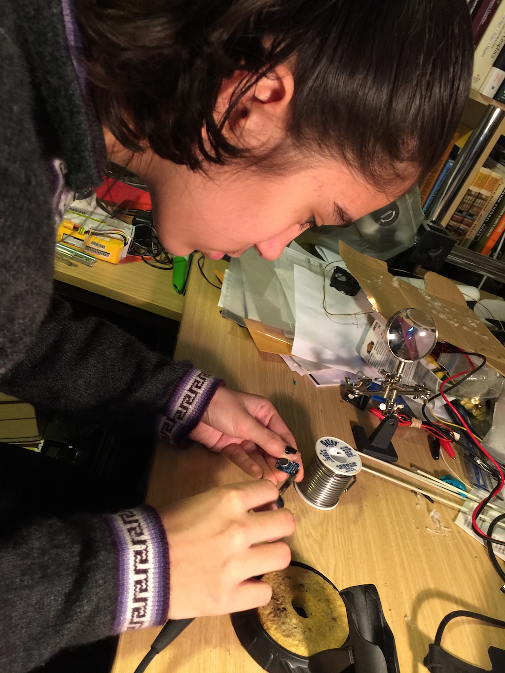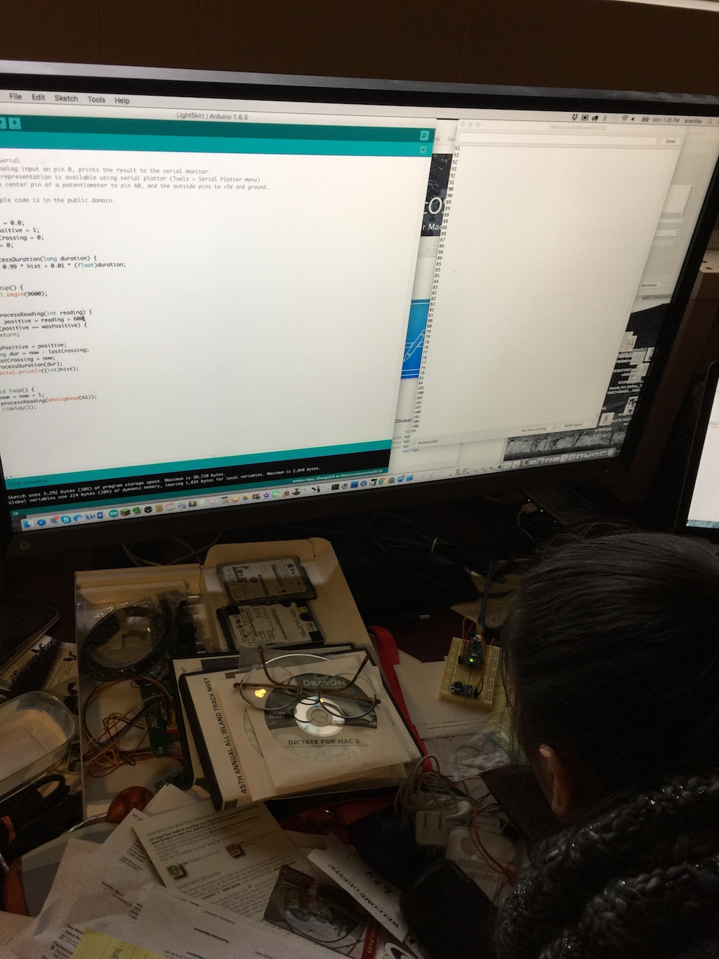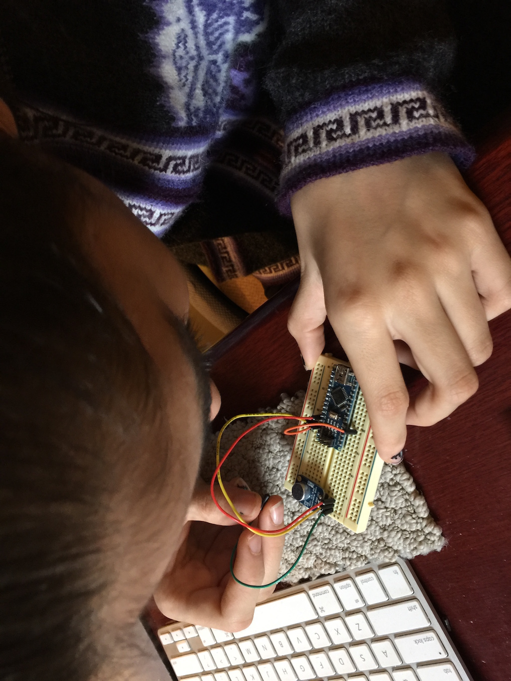 To make the dress change color based on musical notes, I bought a microphone and used it on an Arduino Nano to count so-called “zero crossings.”