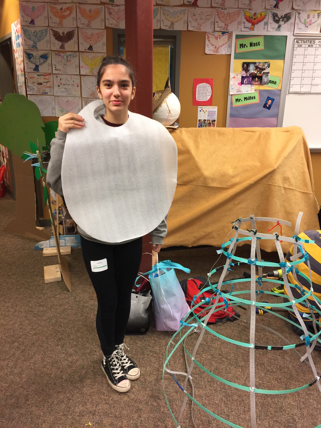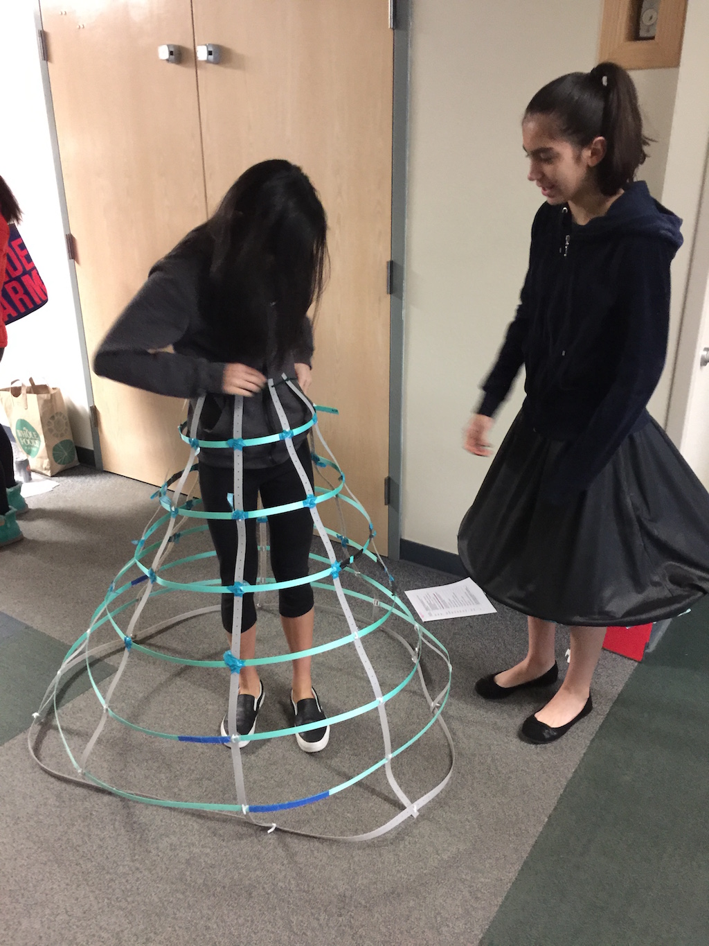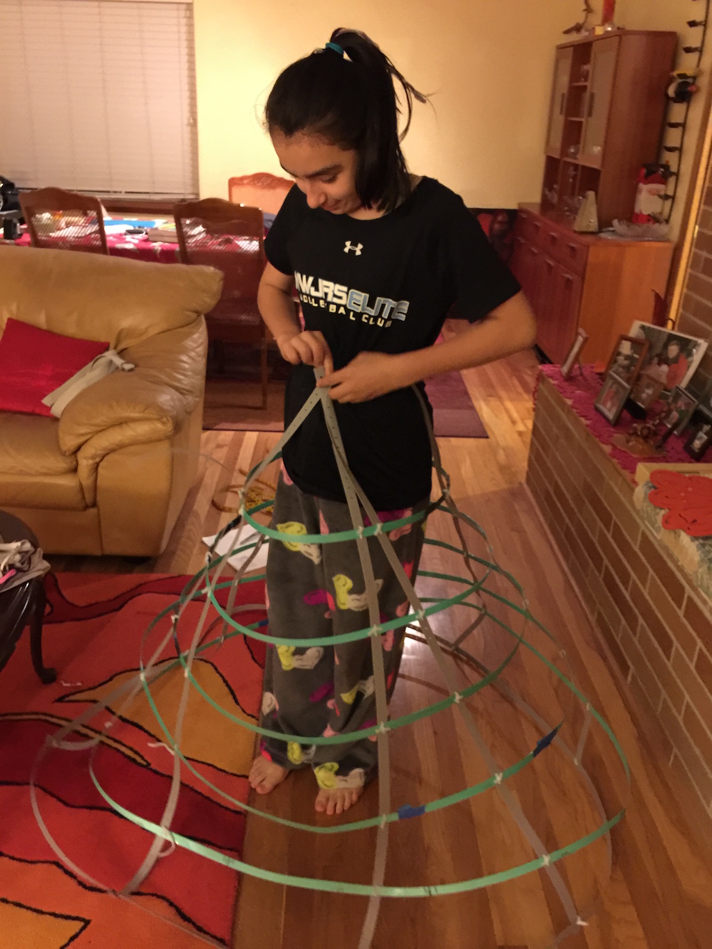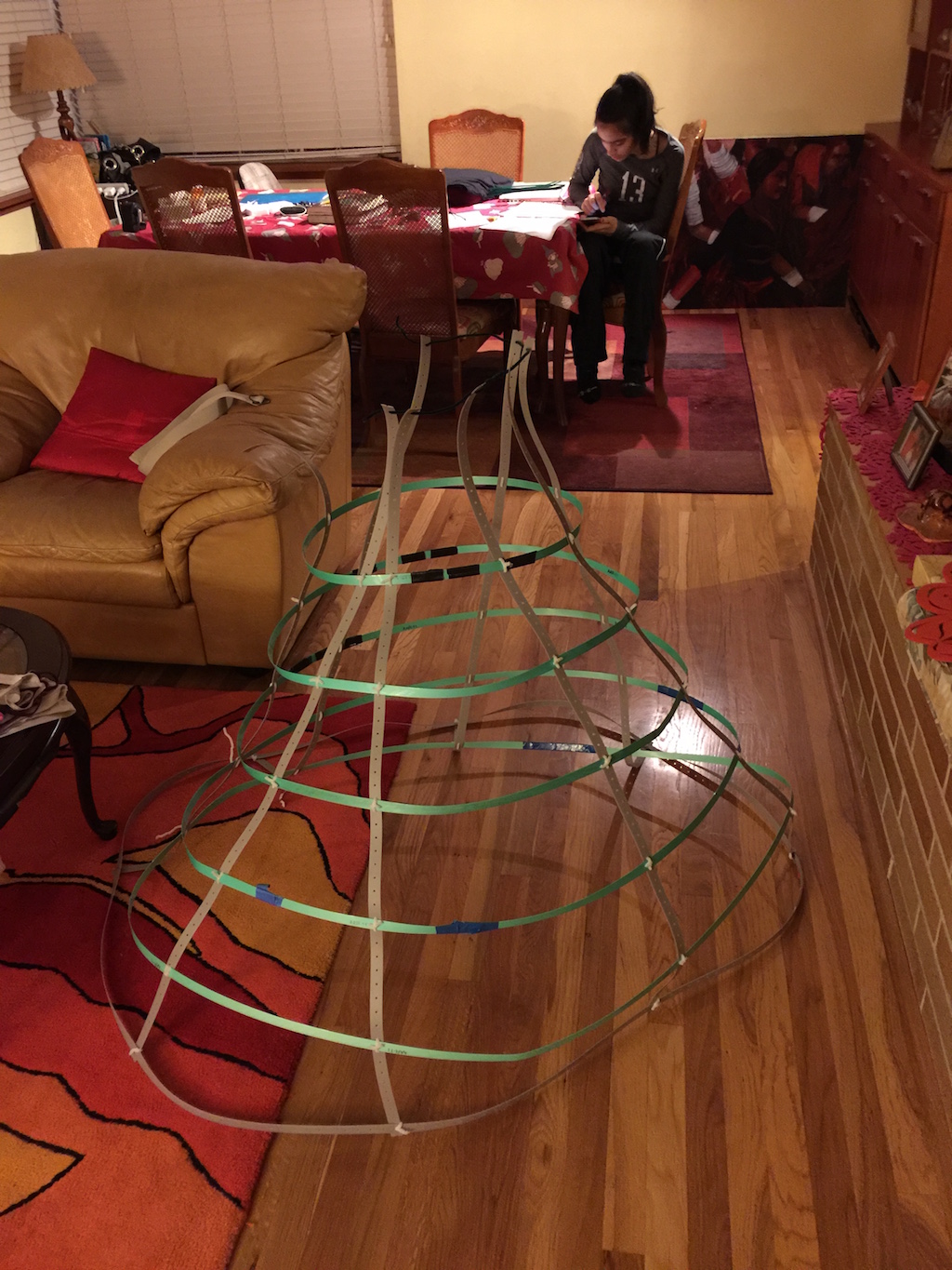 I wanted to make something really cool, and came up with the idea of creating a dress that would light up in waterfall patterns based on music I played. In the DI story, this would be used to put creatures to sleep. This year, my budget was very constrained, so I had to find a good way to make the dress cheaply. I got free packing straps from Home Depot, which I connected with tape and pipe cleaners to make the skirt hoops. Then I used cheap shower curtains to provide a light diffuser around the dress.