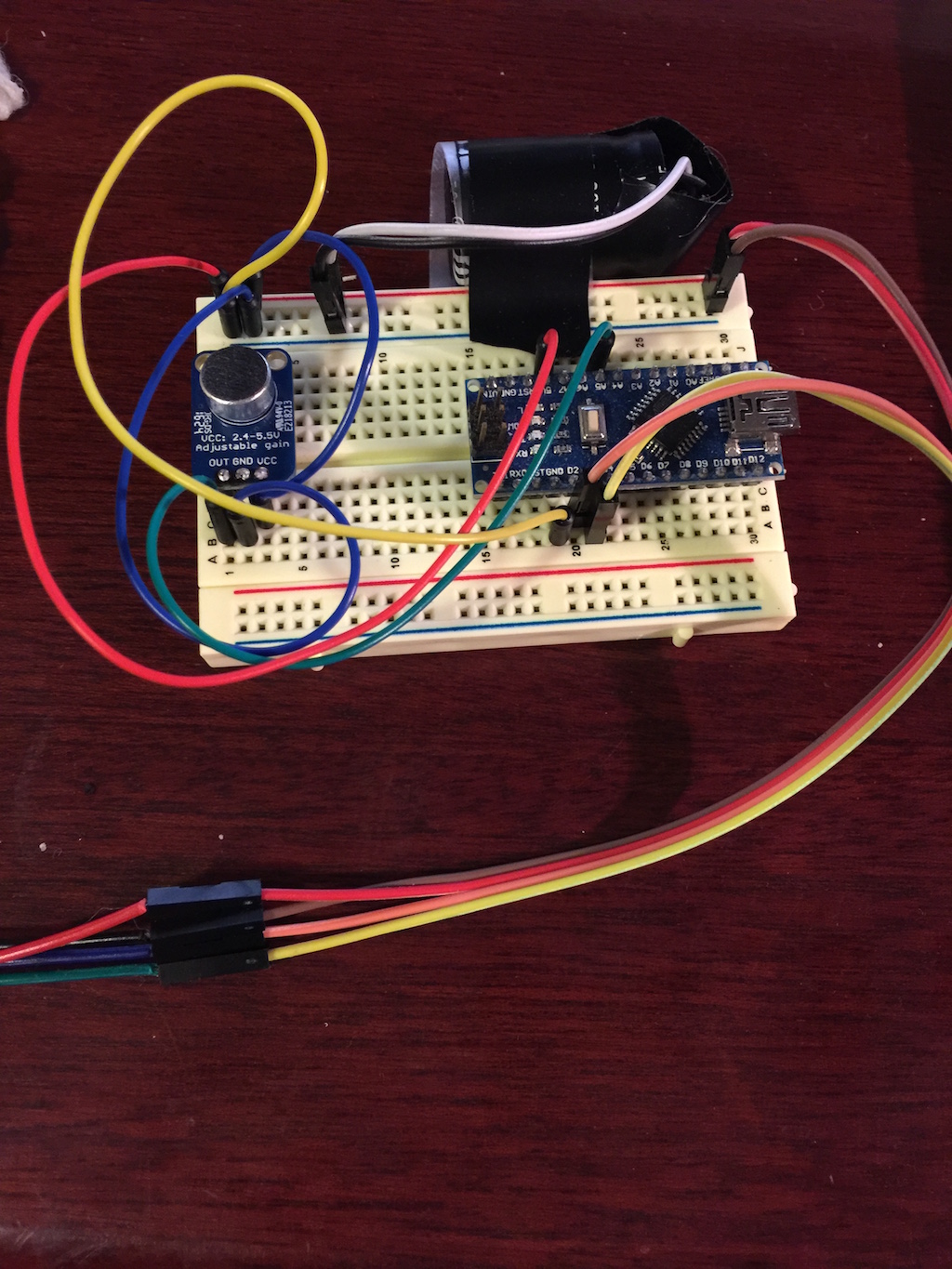 The zero crossings approach actually worked pretty well, until I hooked up the lights and started setting the colors on the lights. I tried fixing it by putting a large capacitor in the circuit, in case power drain from the lights was causing the microphone reading to be inaccurate. But, I now think the problem was because of the type of lights I was using at first. I think they require the Arduino's processor to work hard all the time, and not have enough time to process the sound. I switched to a different type of lights that has little processors between the LEDs to remember what color they're supposed to show, so the Arduino doesn't have to work as hard. But, by the time I switched lights, I had also found a much better way to get the sound frequency. I found a library called FHT (Fast Hartley Transform) for the Arduino, which is a simple and faster version of the FFT (Fast Fourier Transform), which is what is usually used to measure frequencies in sound waves.